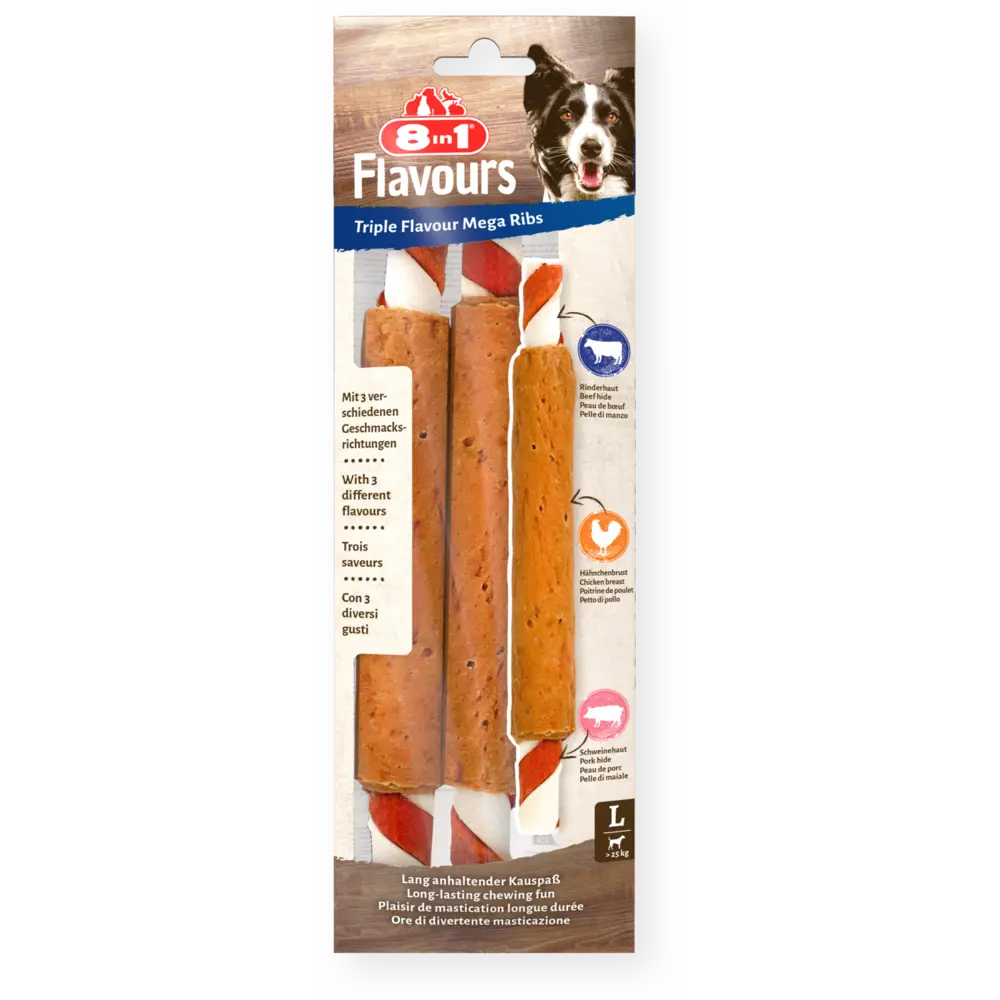 Die 8in1 Triple Flavour Mega Ribs sind perfekt für Hunde, die ausdauernd und mit Begeisterung kauen. Der robuste Kern aus Schweine- und Rinderhaut wird von leckerer Hähnchenbrust umhüllt und bietet damit einen besonders aromatischen und hochwertigen Snack, den Hunde lieben.