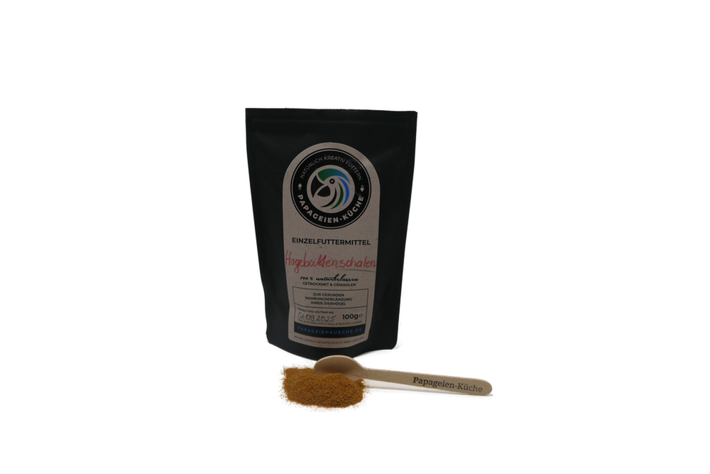 Hagebutten-Schalen-Pulver der Papageien-Küche. Zur gesunden Nahrungsergänzung Ihrer Tiere, kann als natürliches Schmerzmittel bei Magen- und Leberschmerzen eingesetzt werden, wirkt entwässernd und harntreibend, enthält u.a. Gerbstoffe, Flavonoide, Oligosaccharide, Pektinsäure, Vitamin A, C, E und K, Mangan, Kalzium und Magnesium. 100% naturbelassen. Verpackt im klimaneutralen Verpackungsmaterial, dass zum Teil aus Zuckerrohr besteht. Im Lieferumfang ist ein Holzlöffel zur einfachen Entnahme enthalten. Der Standbodenbeutel ist aromaversiegelt und wiederverschließbar. Verpackung mit 100g. Vor Licht geschützt, kühl und trocken lagern.